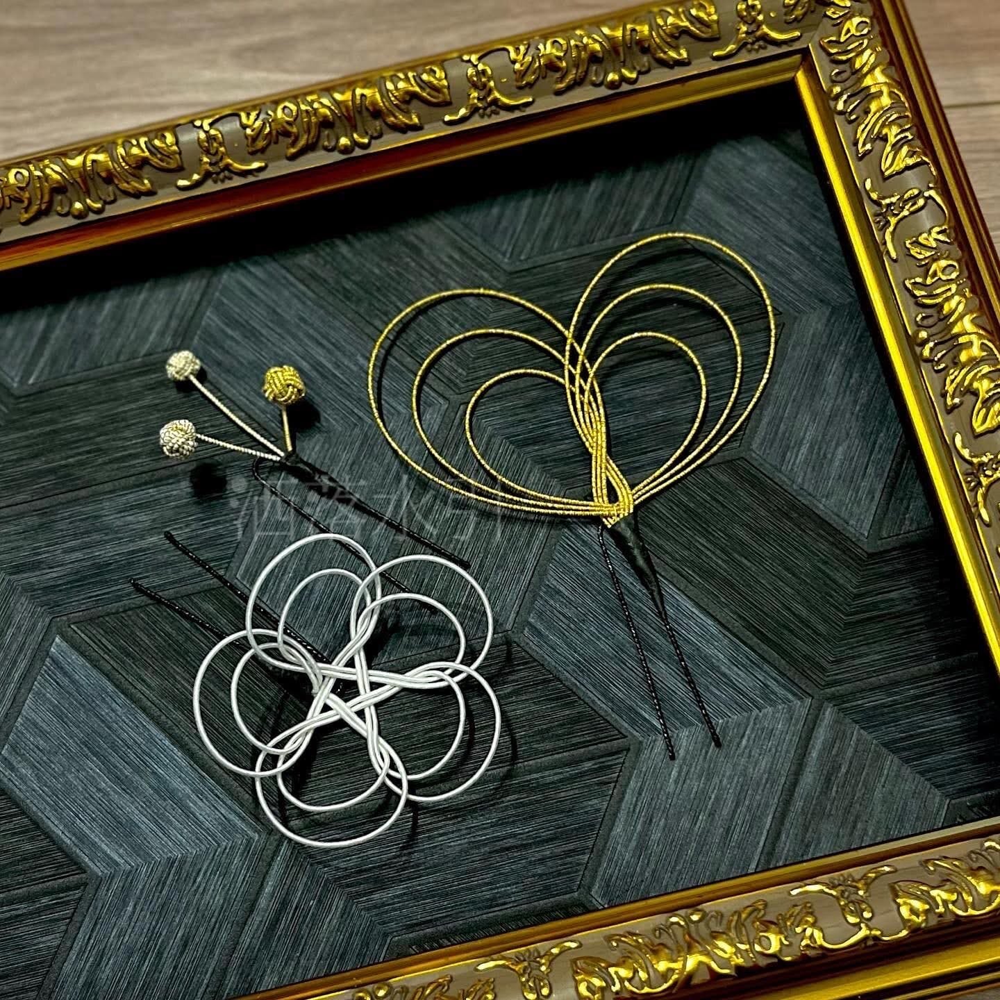 あわじ結びの連続・立体梅結び・松結び・亀結びや、洒落水引オリジナルのハート・八重の花・胡蝶蘭の作り方を習得します。
