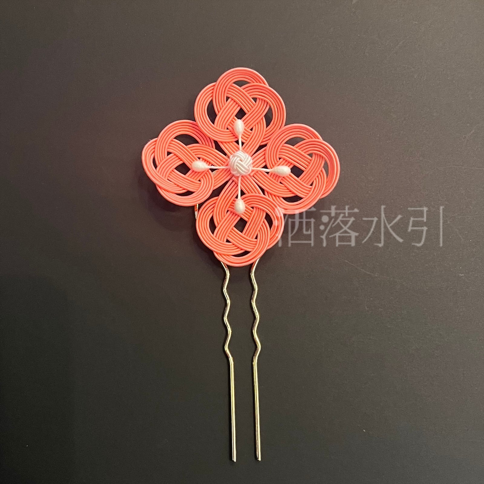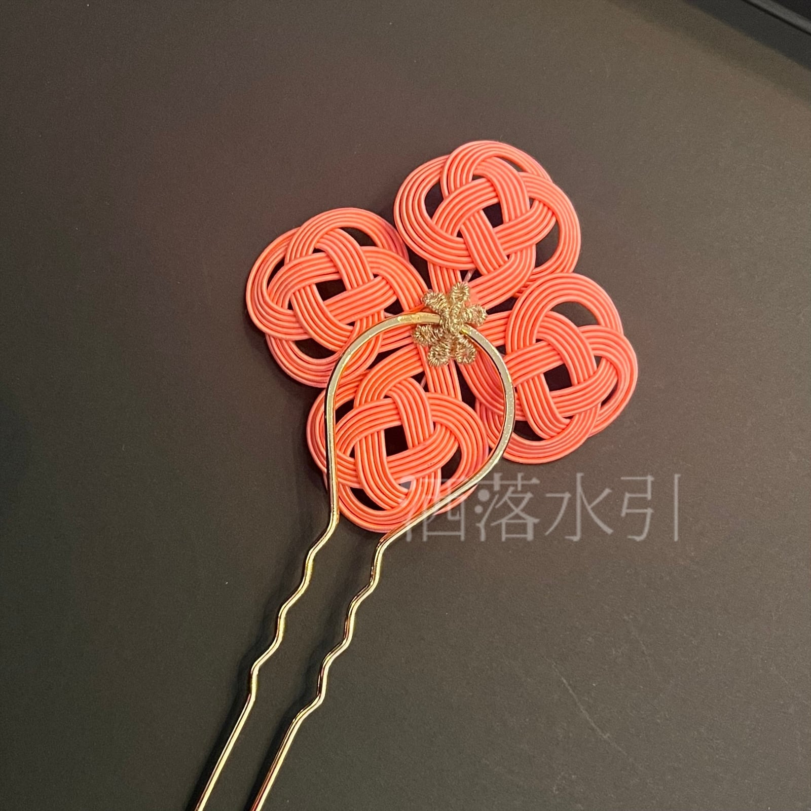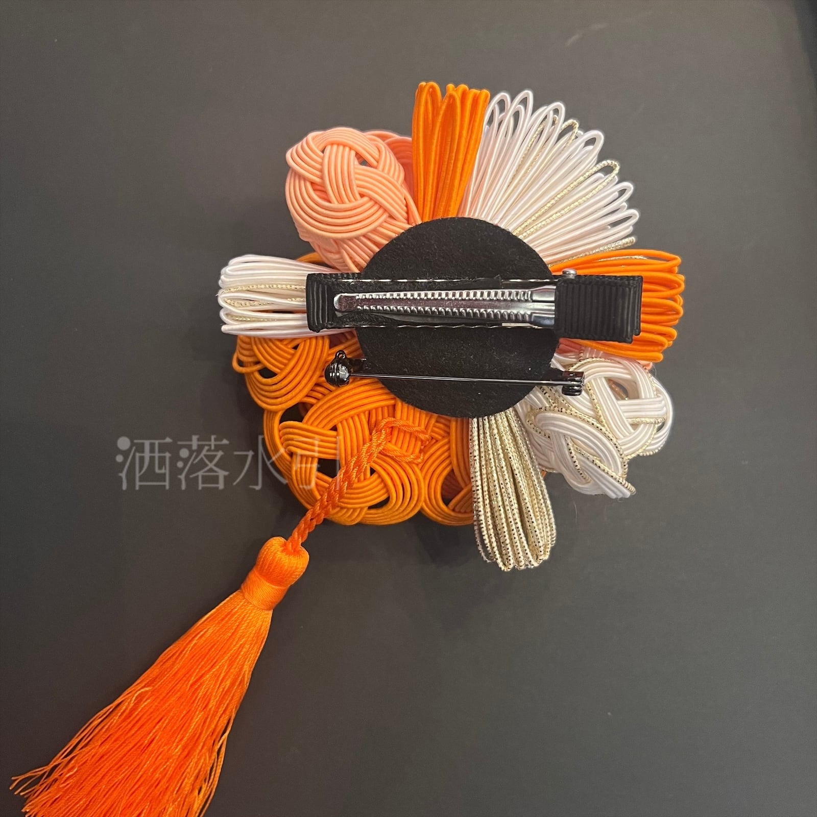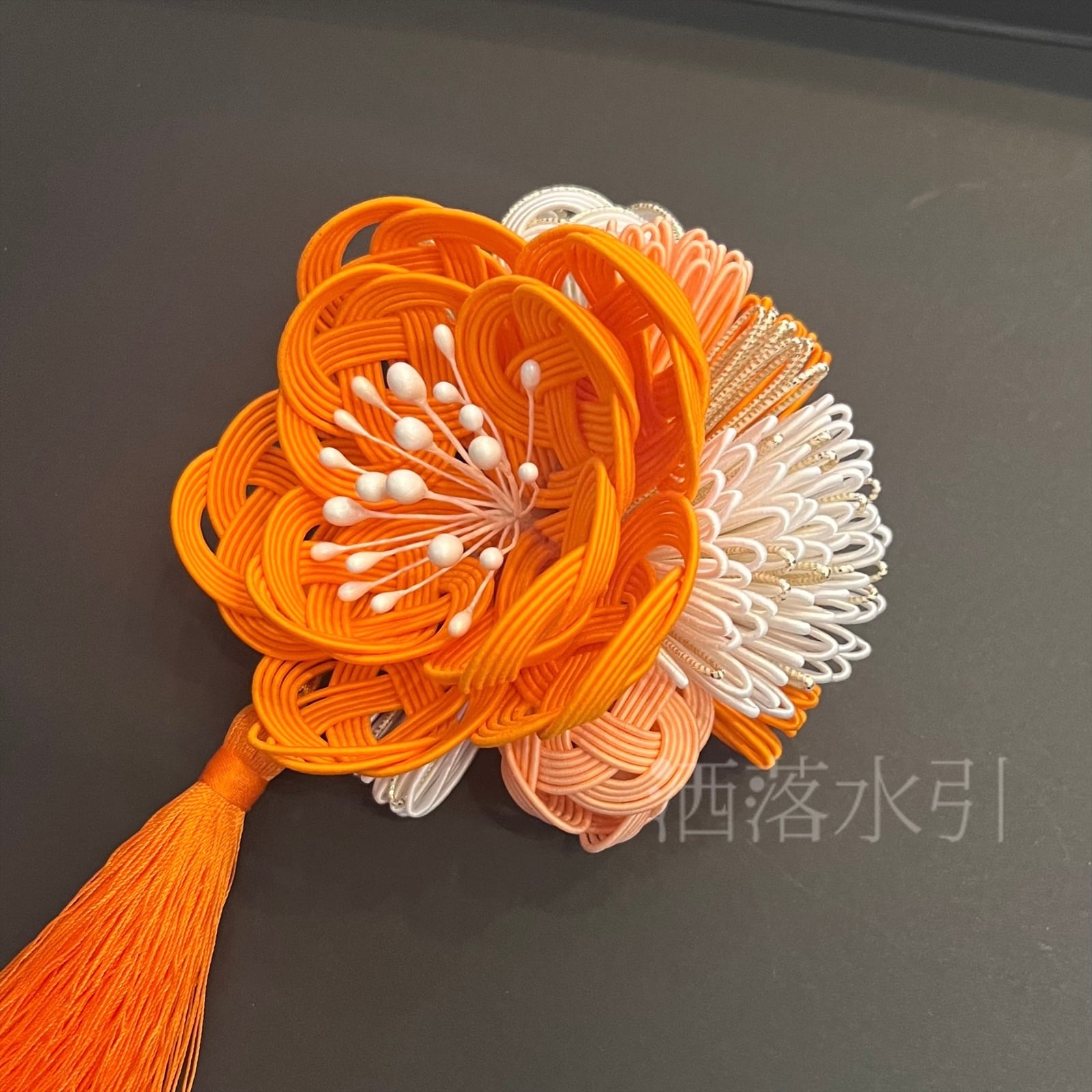 発色の良い蜜柑色の水引の花々が美しく、古典柄から現代的デザインまで様々な主役級の装いにフィットする髪飾り。