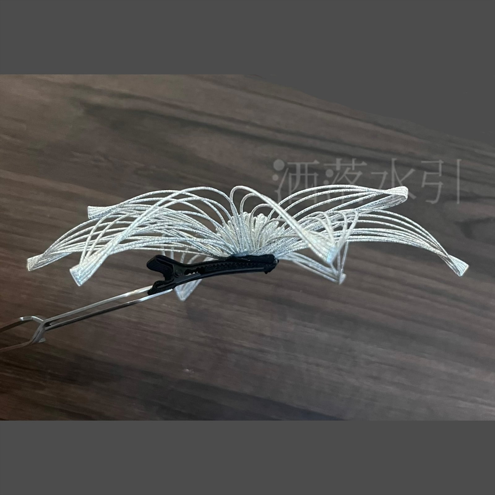 髪の長さを問わず使いやすい、滑り止め付きのクリップ仕様。ややアシンメトリーな花弁の配置は、交差する曲線の美しさを引き立てつつクリップを見えにくくする効果も。中々のボリューム感ですが、頭のカーブに沿う形なので様々なヘアスタイルにフィットします。